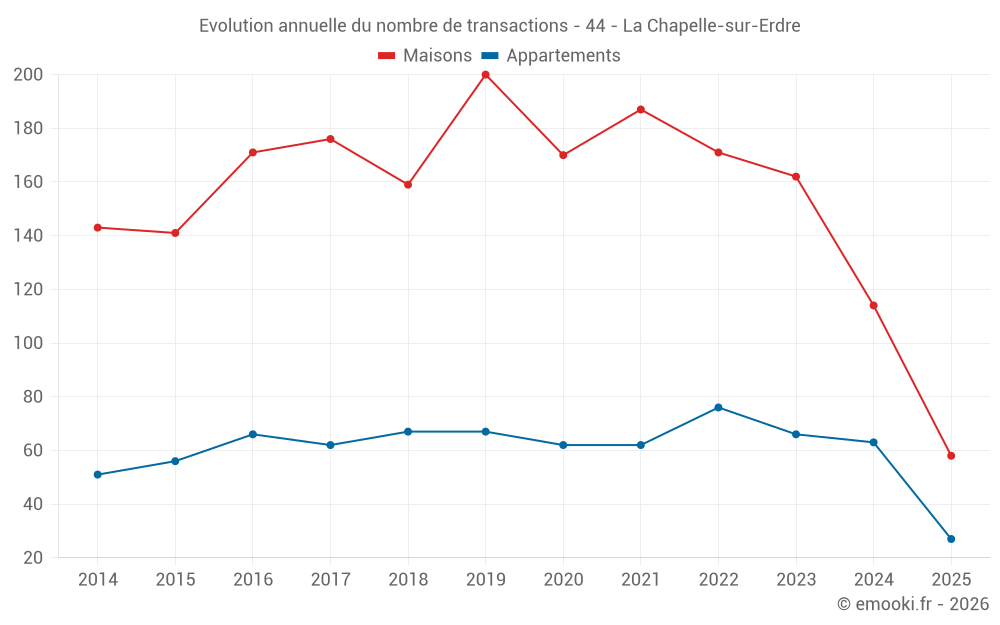 Le prix médian sur les 58 transactions de maisons des 6 derniers mois dans la commune de la Chapelle-sur-Erdre était de 3 368 € par mètre carré pour une valeur foncière médiane de 334 150 €. Sur cette période 60% des transactions se sont situées entre 2 834 et 4 054 € par mètre carré (du 2ème au 8ème déciles).
