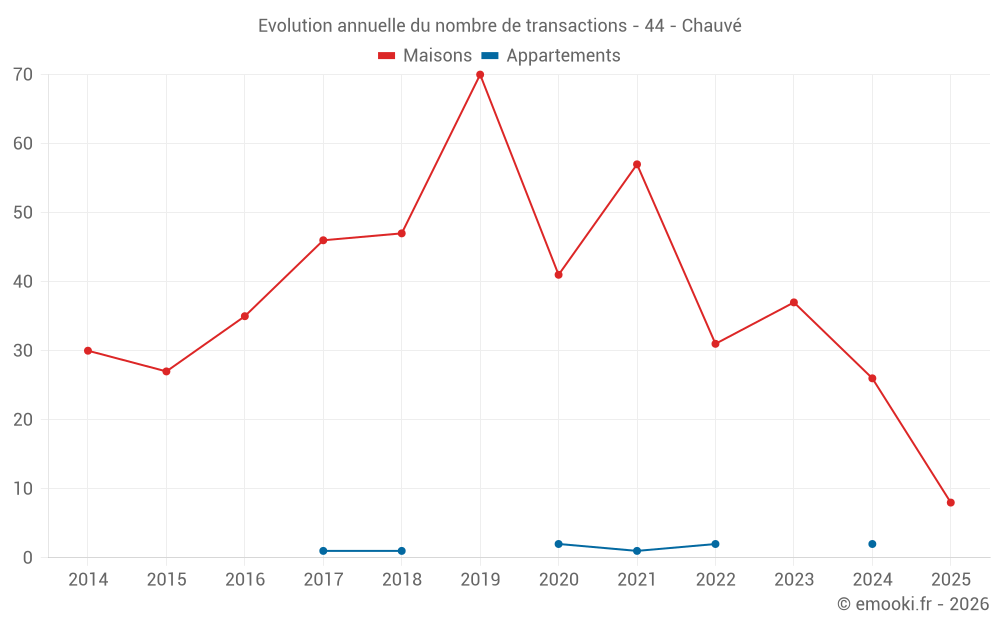 Le prix médian sur les 22 transactions de maisons des 12 derniers mois dans la commune de Chauvé était de 2 523 € par mètre carré pour une valeur foncière médiane de 195 000 €. Sur cette période 60% des transactions se sont situées entre 1 968 et 3 275 € par mètre carré (du 2ème au 8ème déciles).