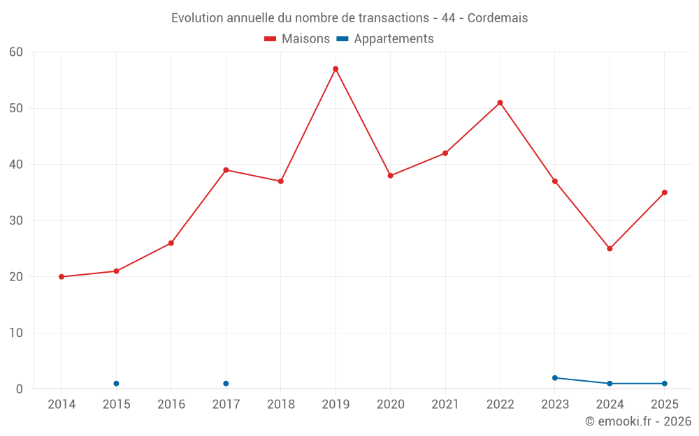 Le prix médian sur les 20 transactions de maisons des 6 derniers mois dans la commune de Cordemais était de 2 183 € par mètre carré pour une valeur foncière médiane de 266 500 €. Sur cette période 60% des transactions se sont situées entre 1 731 et 2 812 € par mètre carré (du 2ème au 8ème déciles).