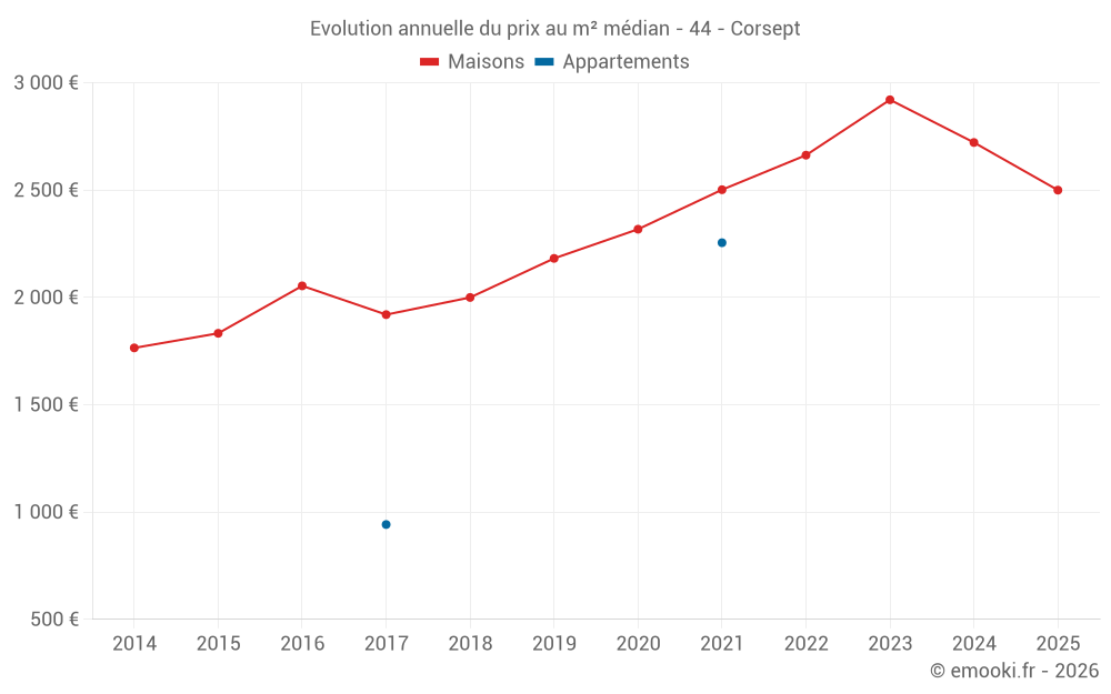 Le prix médian sur les 20 transactions de maisons des 12 derniers mois dans la commune de Corsept était de 2 802 € par mètre carré pour une valeur foncière médiane de 260 000 €. Sur cette période 60% des transactions se sont situées entre 2 396 et 3 080 € par mètre carré (du 2ème au 8ème déciles).