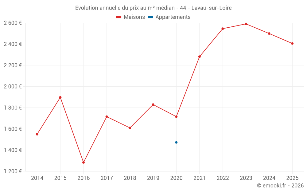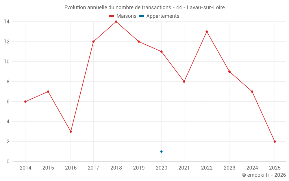 Le prix médian sur les 14 transactions de maisons des 24 derniers mois dans la commune de Lavau-sur-Loire était de 2 546 € par mètre carré pour une valeur foncière médiane de 240 000 €. Sur cette période 60% des transactions se sont situées entre 1 736 et 2 854 € par mètre carré (du 2ème au 8ème déciles).