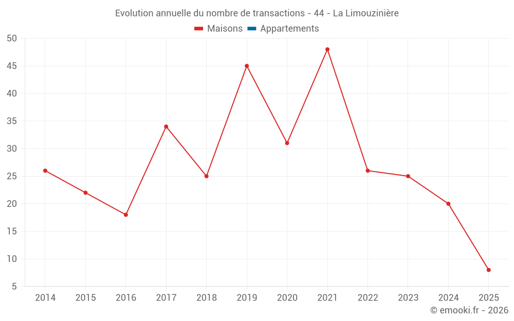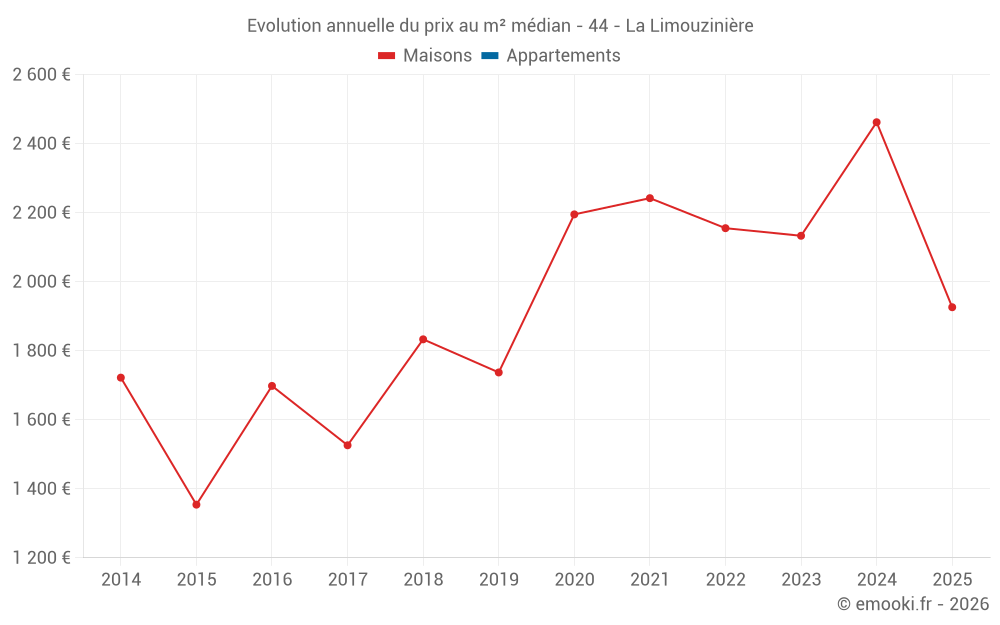 Le prix médian sur les 20 transactions de maisons des 12 derniers mois dans la commune de la Limouzinière était de 2 208 € par mètre carré pour une valeur foncière médiane de 229 000 €. Sur cette période 60% des transactions se sont situées entre 1 882 et 2 688 € par mètre carré (du 2ème au 8ème déciles).
