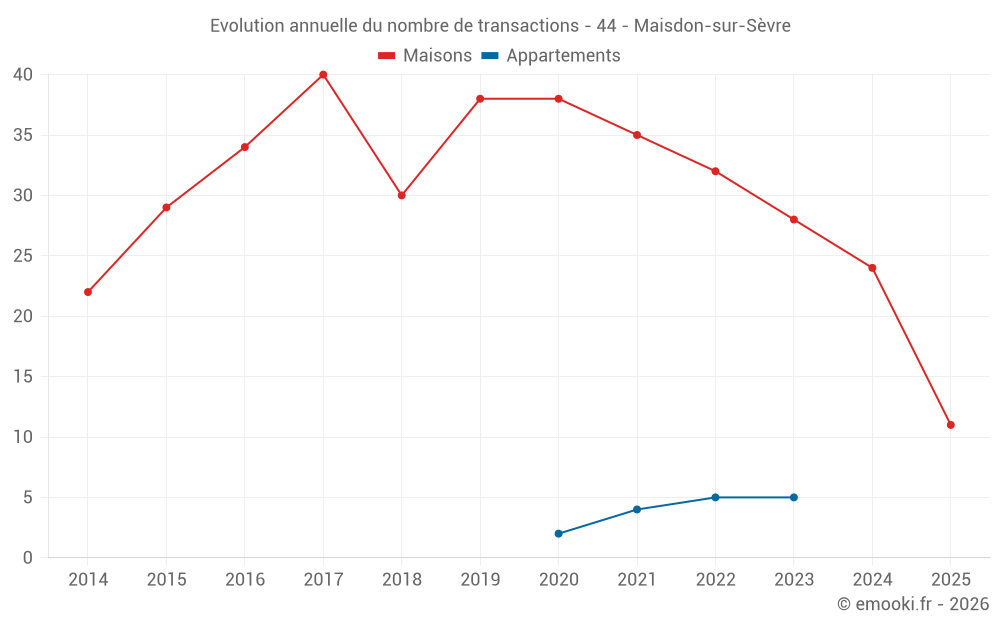 Le prix médian sur les 23 transactions de maisons des 12 derniers mois dans la commune de Maisdon-sur-Sèvre était de 2 607 € par mètre carré pour une valeur foncière médiane de 235 000 €. Sur cette période 60% des transactions se sont situées entre 2 133 et 3 156 € par mètre carré (du 2ème au 8ème déciles).