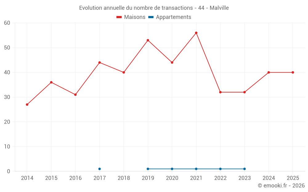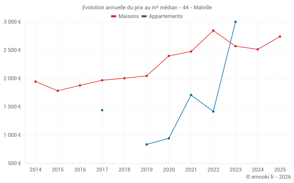 Le prix médian sur les 22 transactions de maisons des 6 derniers mois dans la commune de Malville était de 2 994 € par mètre carré pour une valeur foncière médiane de 235 500 €. Sur cette période 60% des transactions se sont situées entre 2 266 et 3 107 € par mètre carré (du 2ème au 8ème déciles).