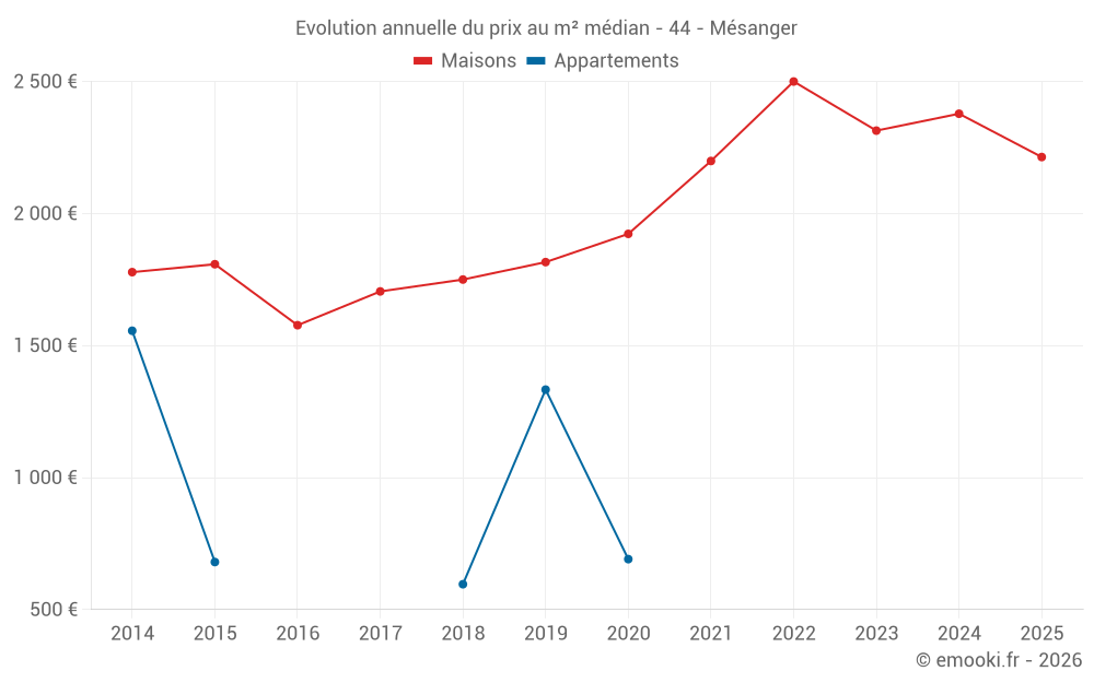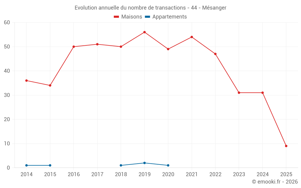 Le prix médian sur les 24 transactions de maisons des 12 derniers mois dans la commune de Mésanger était de 2 296 € par mètre carré pour une valeur foncière médiane de 200 000 €. Sur cette période 60% des transactions se sont situées entre 1 847 et 2 853 € par mètre carré (du 2ème au 8ème déciles).