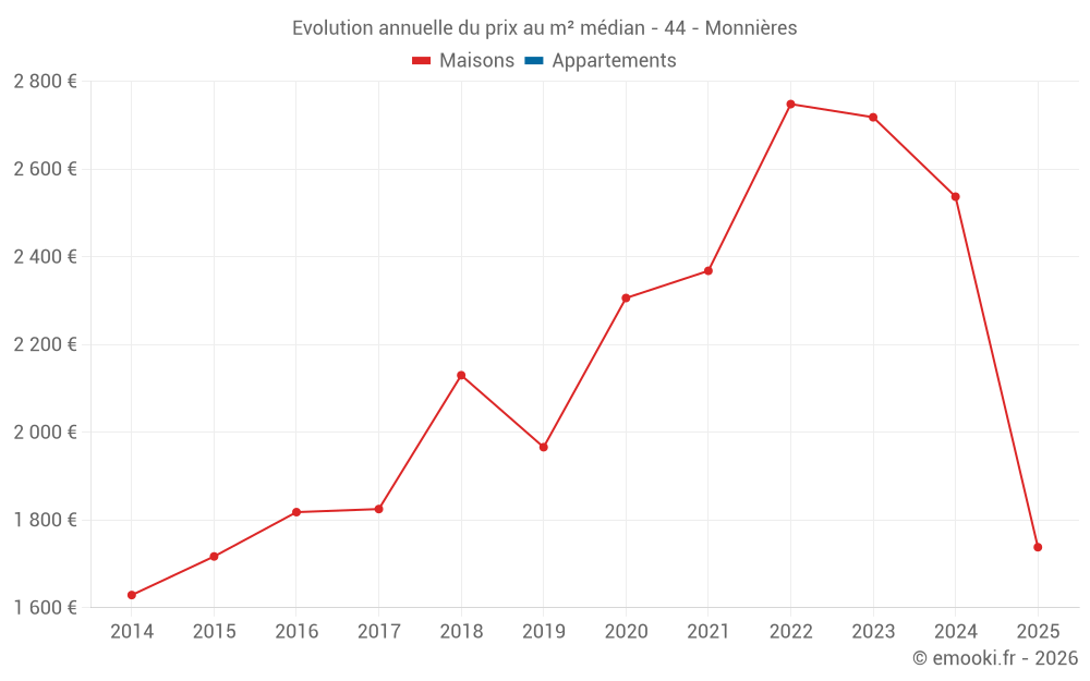 Le prix médian sur les 21 transactions de maisons des 12 derniers mois dans la commune de Monnières était de 2 227 € par mètre carré pour une valeur foncière médiane de 214 000 €. Sur cette période 60% des transactions se sont situées entre 1 418 et 2 913 € par mètre carré (du 2ème au 8ème déciles).