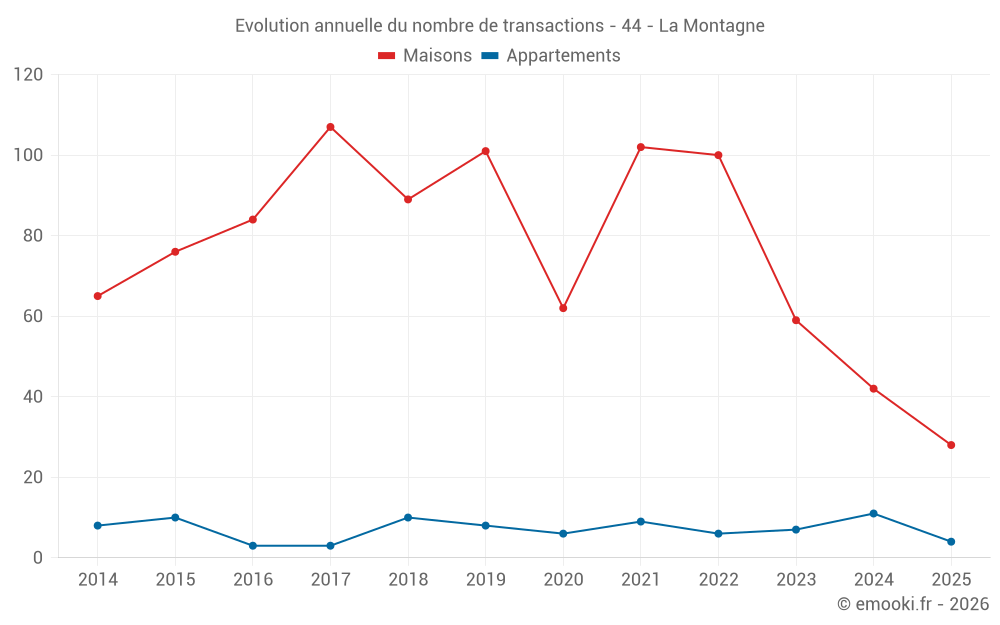 Le prix médian sur les 28 transactions de maisons des 6 derniers mois dans la commune de la Montagne était de 2 893 € par mètre carré pour une valeur foncière médiane de 274 518 €. Sur cette période 60% des transactions se sont situées entre 2 127 et 3 307 € par mètre carré (du 2ème au 8ème déciles).