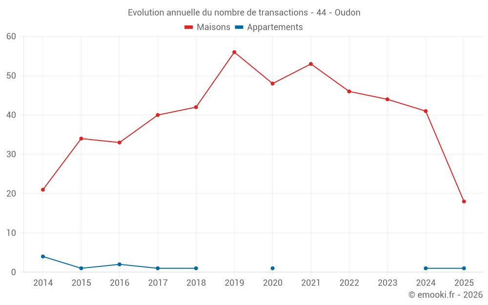 Le prix médian sur les 18 transactions de maisons des 6 derniers mois dans la commune d'Oudon était de 2 392 € par mètre carré pour une valeur foncière médiane de 334 250 €. Sur cette période 60% des transactions se sont situées entre 1 880 et 2 921 € par mètre carré (du 2ème au 8ème déciles).