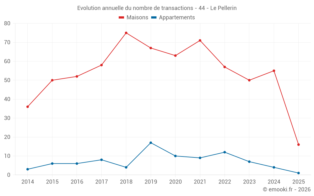 Le prix médian sur les 46 transactions de maisons des 12 derniers mois dans la commune du Pellerin était de 2 653 € par mètre carré pour une valeur foncière médiane de 242 500 €. Sur cette période 60% des transactions se sont situées entre 1 857 et 3 065 € par mètre carré (du 2ème au 8ème déciles).