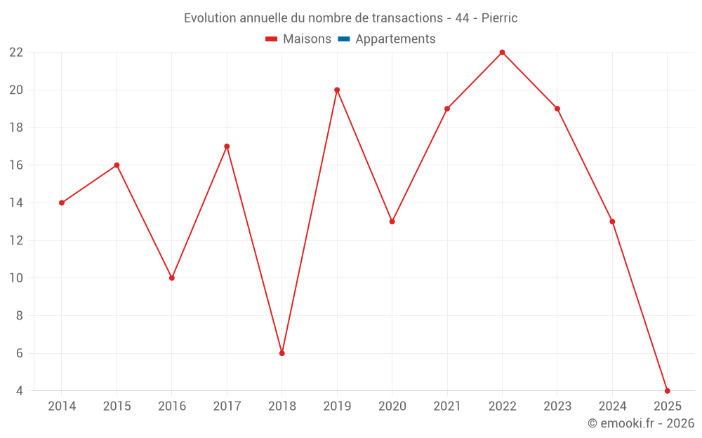 Le prix médian sur les 28 transactions de maisons des 24 derniers mois dans la commune de Pierric était de 1 452 € par mètre carré pour une valeur foncière médiane de 157 500 €. Sur cette période 60% des transactions se sont situées entre 826 et 1 676 € par mètre carré (du 2ème au 8ème déciles).