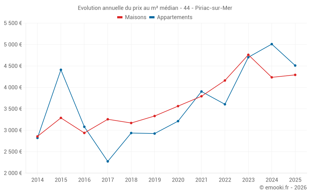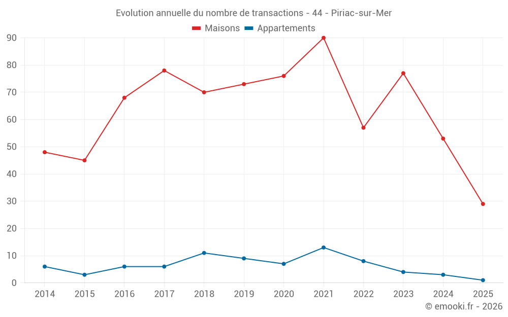 Le prix médian sur les 29 transactions de maisons des 6 derniers mois dans la commune de Piriac-sur-Mer était de 4 293 € par mètre carré pour une valeur foncière médiane de 409 900 €. Sur cette période 60% des transactions se sont situées entre 3 010 et 6 122 € par mètre carré (du 2ème au 8ème déciles).