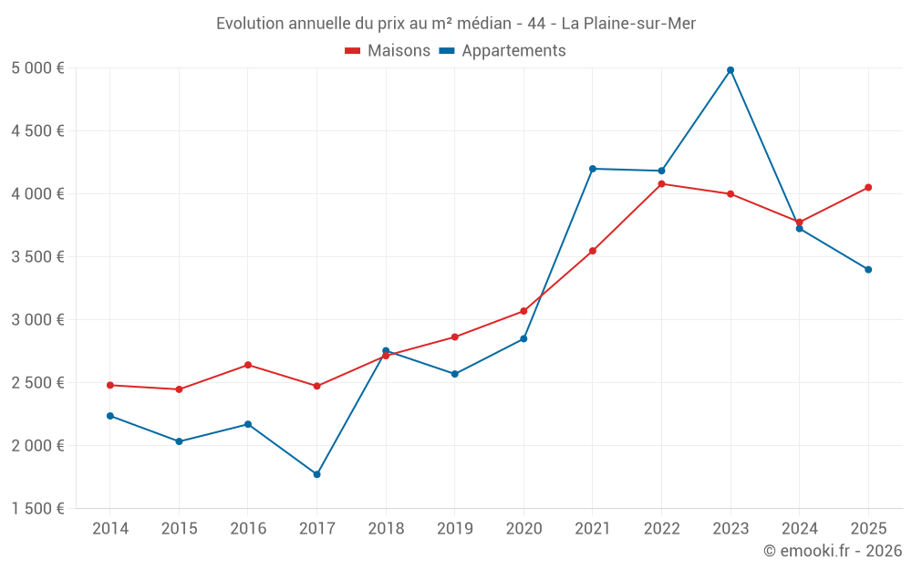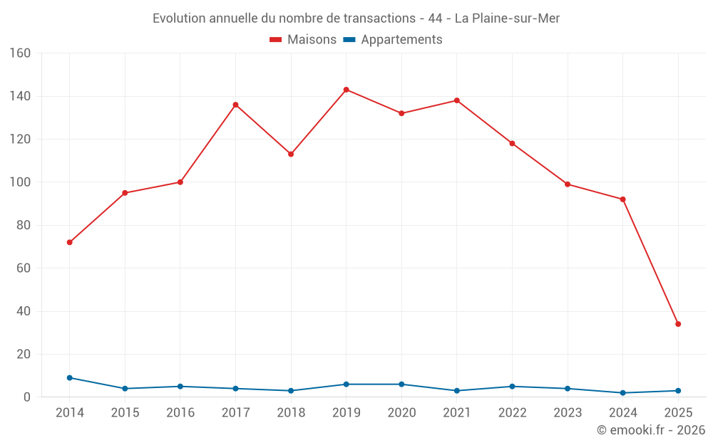 Le prix médian sur les 34 transactions de maisons des 6 derniers mois dans la commune de la Plaine-sur-Mer était de 4 052 € par mètre carré pour une valeur foncière médiane de 275 000 €. Sur cette période 60% des transactions se sont situées entre 3 537 et 4 595 € par mètre carré (du 2ème au 8ème déciles).