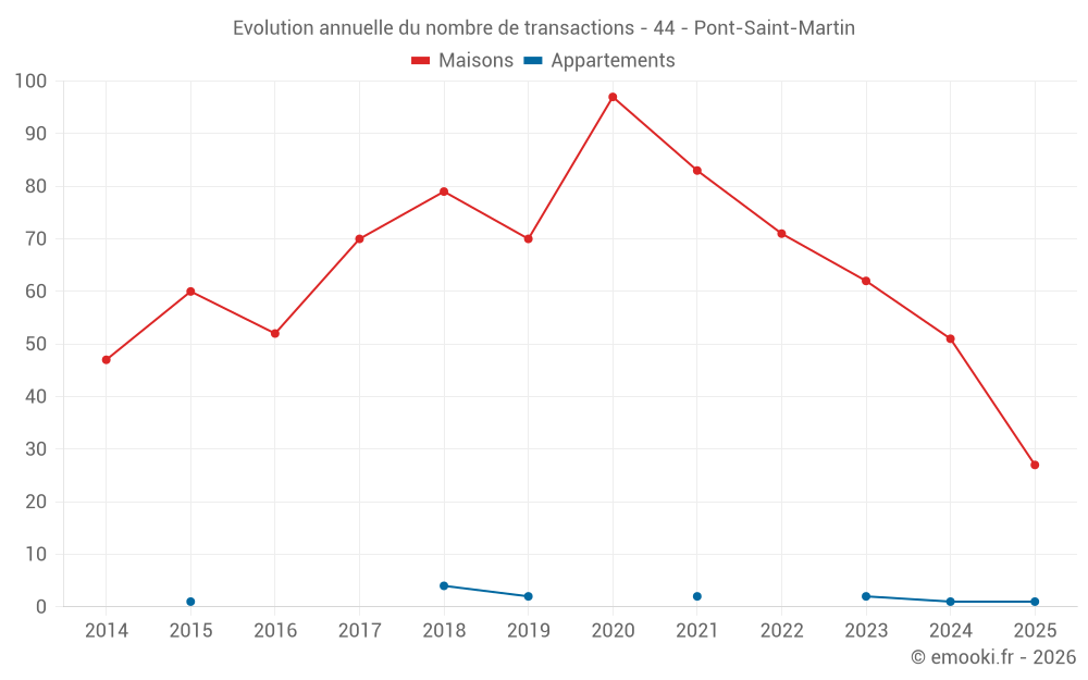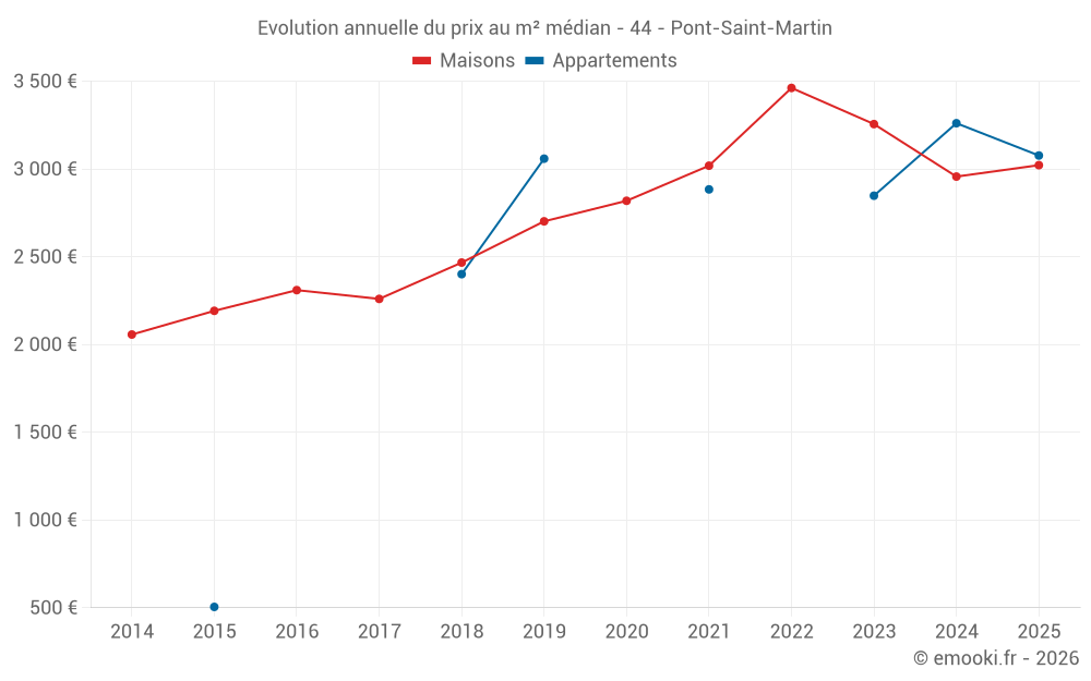 Le prix médian sur les 27 transactions de maisons des 6 derniers mois dans la commune de Pont-Saint-Martin était de 3 022 € par mètre carré pour une valeur foncière médiane de 289 900 €. Sur cette période 60% des transactions se sont situées entre 2 554 et 3 351 € par mètre carré (du 2ème au 8ème déciles).