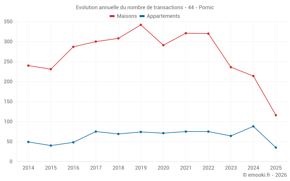 Le prix médian sur les 45 transactions de maisons des 3 derniers mois dans la commune de Pornic était de 4 688 € par mètre carré pour une valeur foncière médiane de 415 000 €. Sur cette période 60% des transactions se sont situées entre 3 554 et 6 761 € par mètre carré (du 2ème au 8ème déciles).
