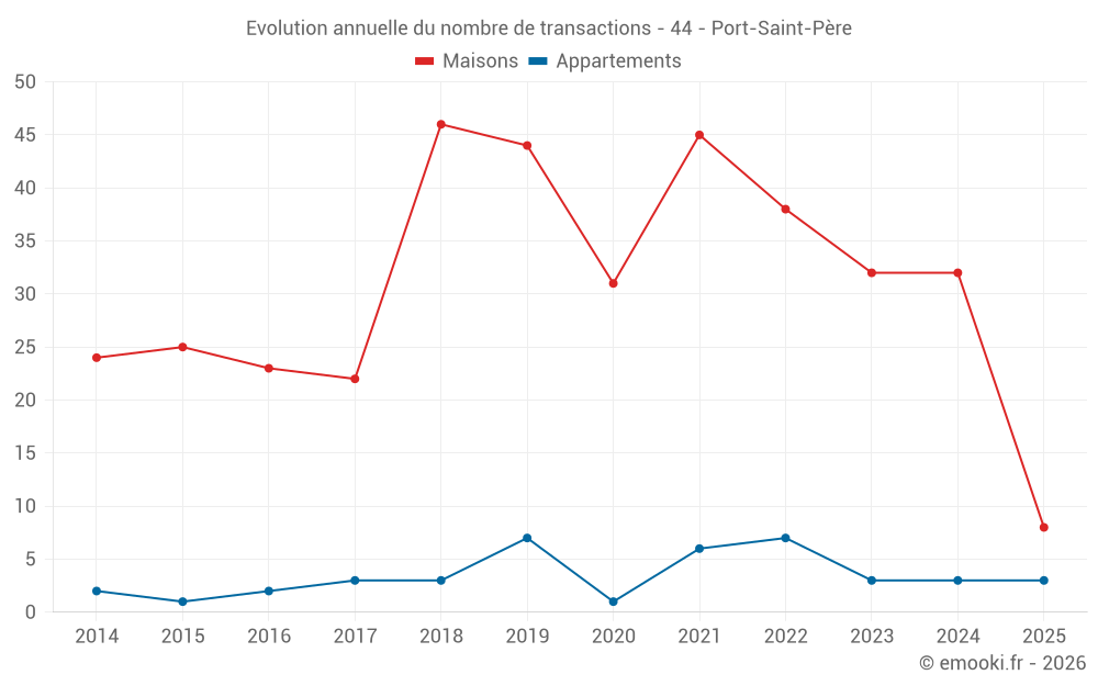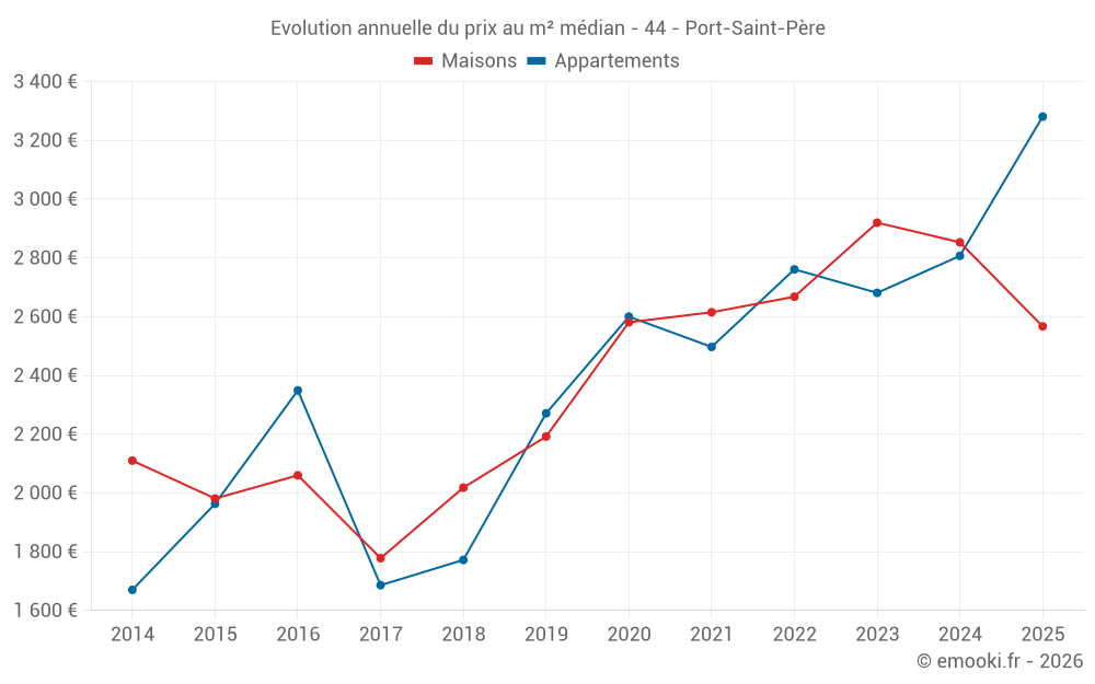 Le prix médian sur les 34 transactions de maisons des 12 derniers mois dans la commune de Port-Saint-Père était de 2 856 € par mètre carré pour une valeur foncière médiane de 273 250 €. Sur cette période 60% des transactions se sont situées entre 2 017 et 3 278 € par mètre carré (du 2ème au 8ème déciles).