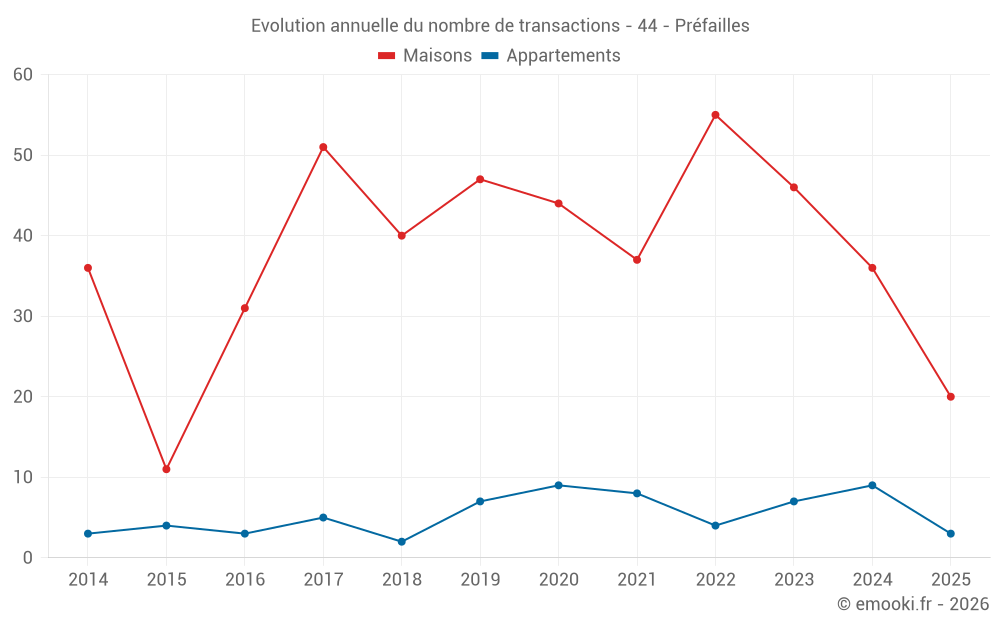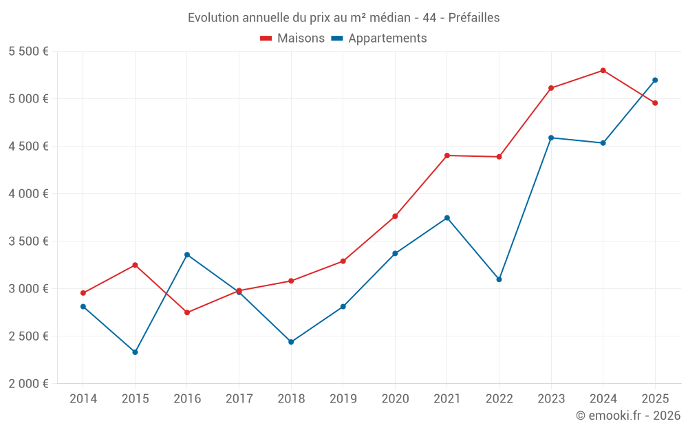 Le prix médian sur les 20 transactions de maisons des 6 derniers mois dans la commune de Préfailles était de 4 956 € par mètre carré pour une valeur foncière médiane de 432 500 €. Sur cette période 60% des transactions se sont situées entre 3 942 et 6 922 € par mètre carré (du 2ème au 8ème déciles).