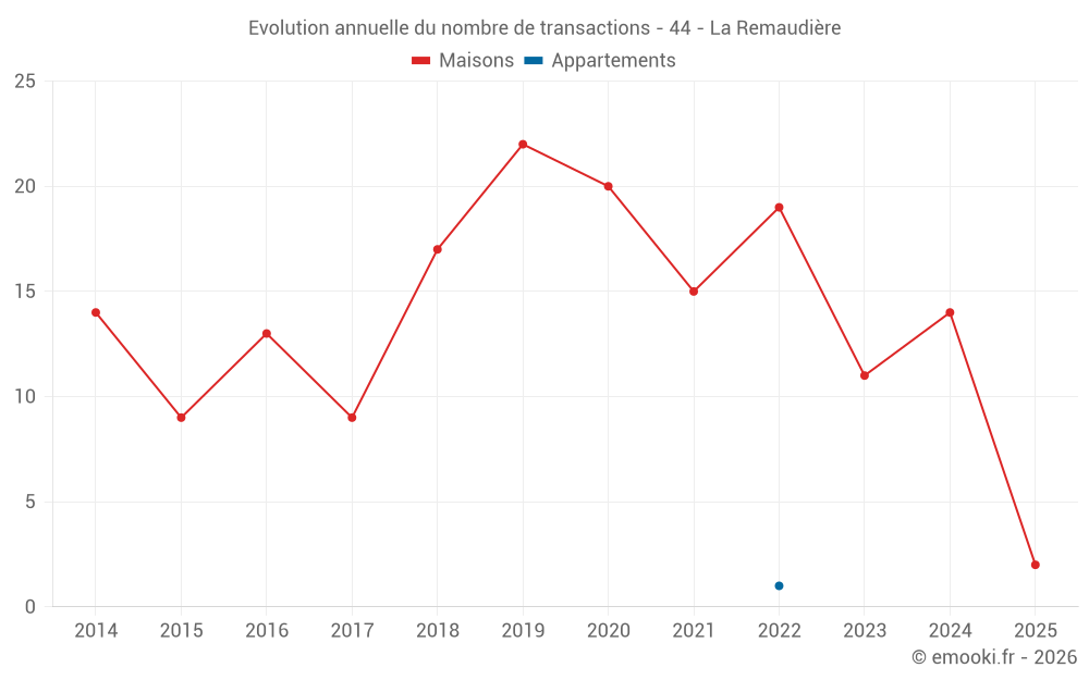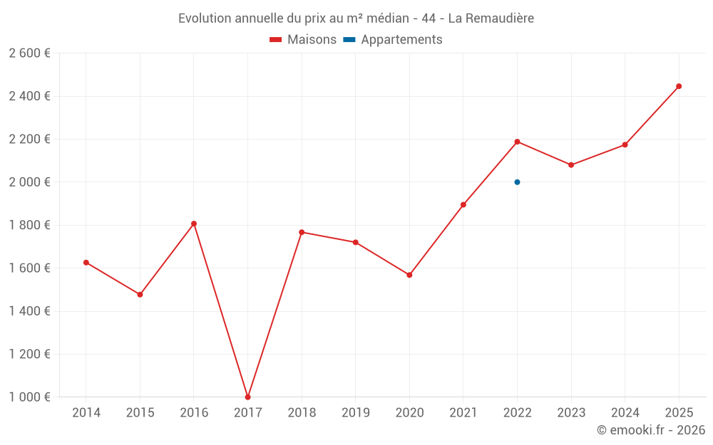 Le prix médian sur les 21 transactions de maisons des 24 derniers mois dans la commune de la Remaudière était de 2 275 € par mètre carré pour une valeur foncière médiane de 240 485 €. Sur cette période 60% des transactions se sont situées entre 1 728 et 2 549 € par mètre carré (du 2ème au 8ème déciles).