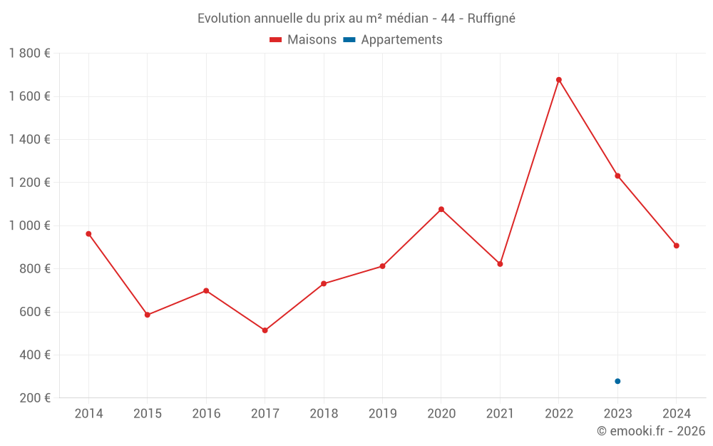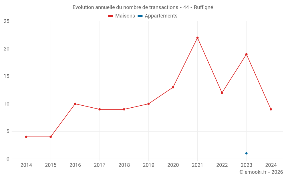 Le prix médian sur les 20 transactions de maisons des 24 derniers mois dans la commune de Ruffigné était de 1 178 € par mètre carré pour une valeur foncière médiane de 100 000 €. Sur cette période 60% des transactions se sont situées entre 569 et 1 521 € par mètre carré (du 2ème au 8ème déciles).