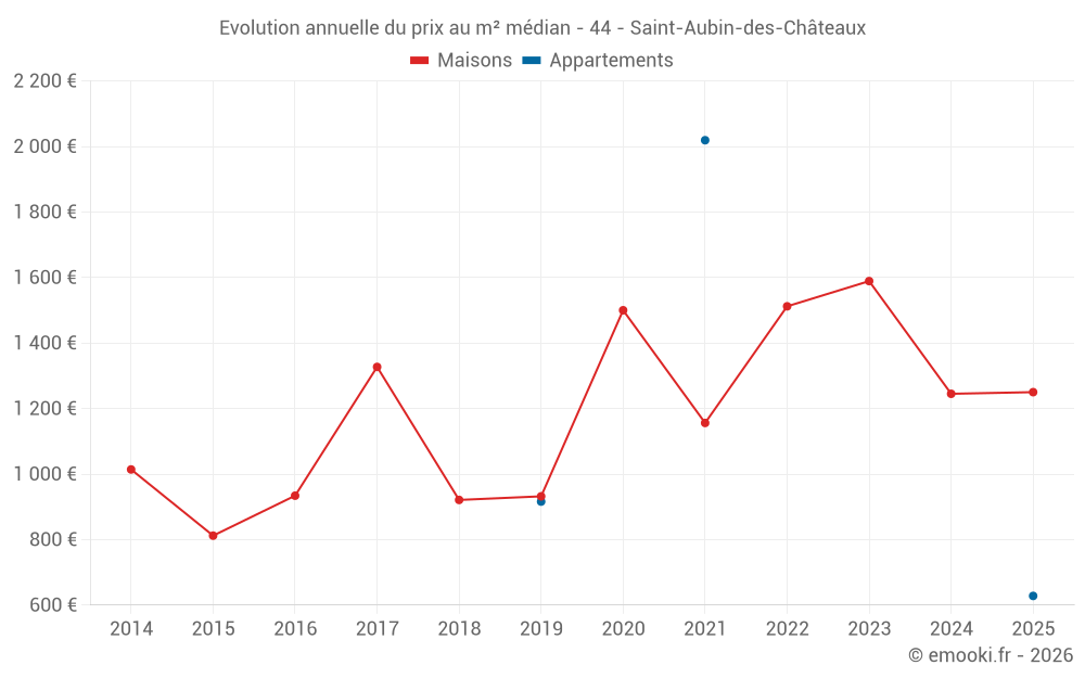 Le prix médian sur les 31 transactions de maisons des 24 derniers mois dans la commune de Saint-Aubin-des-Châteaux était de 1 420 € par mètre carré pour une valeur foncière médiane de 150 000 €. Sur cette période 60% des transactions se sont situées entre 1 170 et 1 900 € par mètre carré (du 2ème au 8ème déciles).