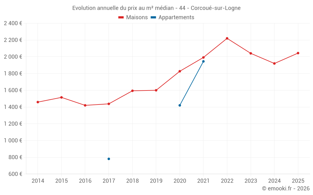 Le prix médian sur les 26 transactions de maisons des 12 derniers mois dans la commune de Corcoué-sur-Logne était de 1 926 € par mètre carré pour une valeur foncière médiane de 181 050 €. Sur cette période 60% des transactions se sont situées entre 1 566 et 2 661 € par mètre carré (du 2ème au 8ème déciles).