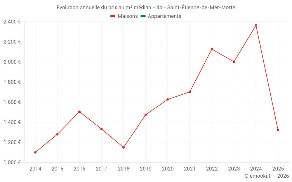 Le prix médian sur les 16 transactions de maisons des 12 derniers mois dans la commune de Saint-Étienne-de-Mer-Morte était de 1 895 € par mètre carré pour une valeur foncière médiane de 140 000 €. Sur cette période 60% des transactions se sont situées entre 1 325 et 2 627 € par mètre carré (du 2ème au 8ème déciles).