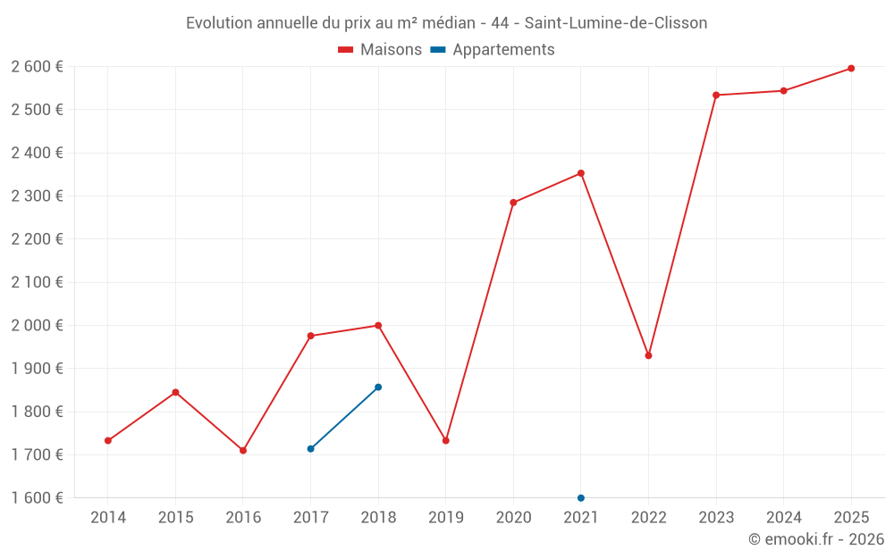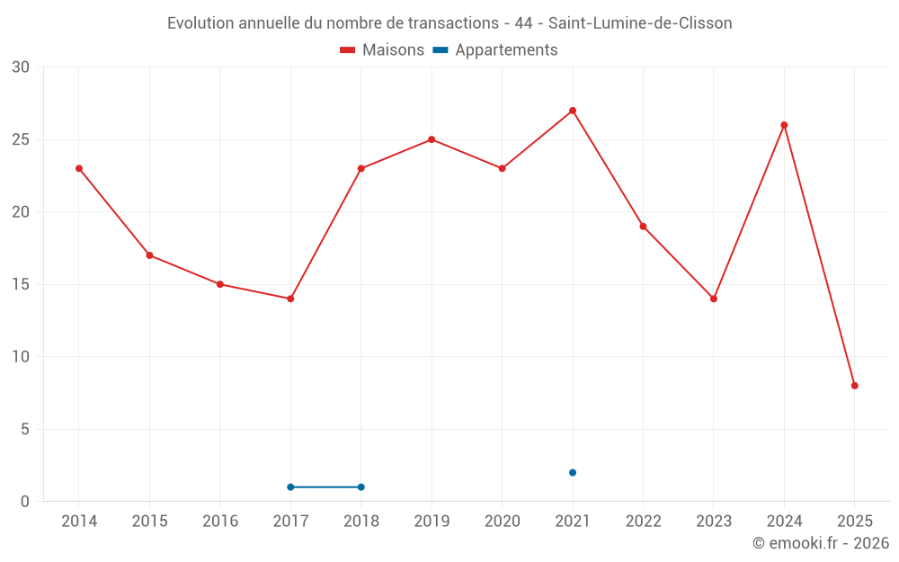 Le prix médian sur les 28 transactions de maisons des 12 derniers mois dans la commune de Saint-Lumine-de-Clisson était de 2 531 € par mètre carré pour une valeur foncière médiane de 232 500 €. Sur cette période 60% des transactions se sont situées entre 1 833 et 2 849 € par mètre carré (du 2ème au 8ème déciles).
