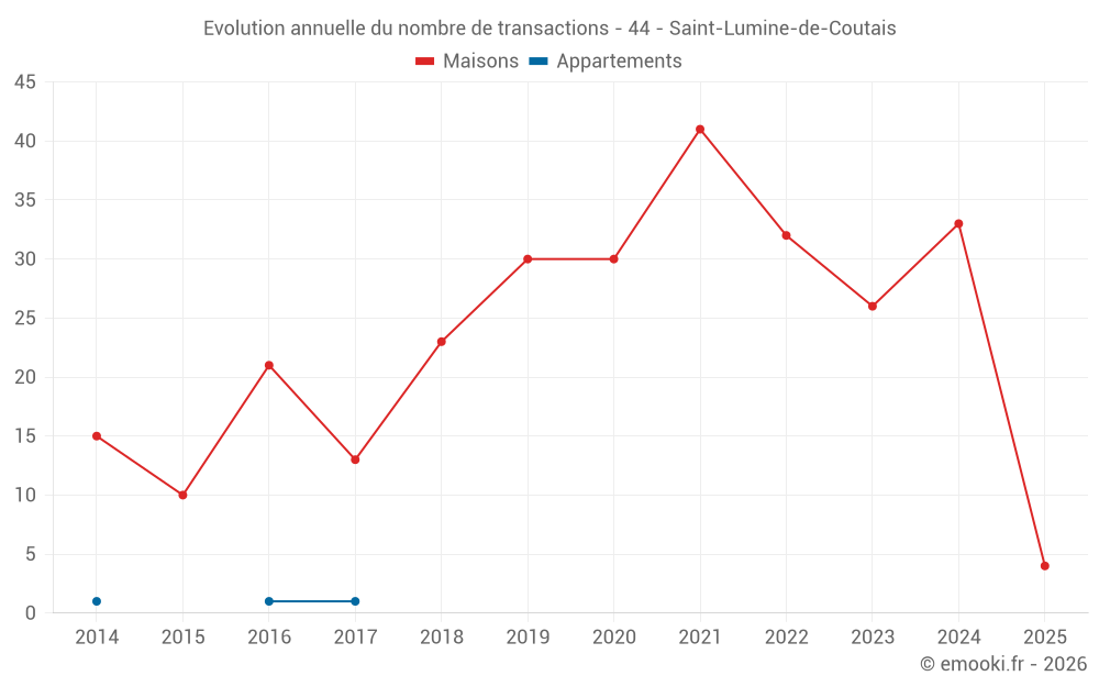 Le prix médian sur les 19 transactions de maisons des 12 derniers mois dans la commune de Saint-Lumine-de-Coutais était de 2 250 € par mètre carré pour une valeur foncière médiane de 190 000 €. Sur cette période 60% des transactions se sont situées entre 1 550 et 2 702 € par mètre carré (du 2ème au 8ème déciles).