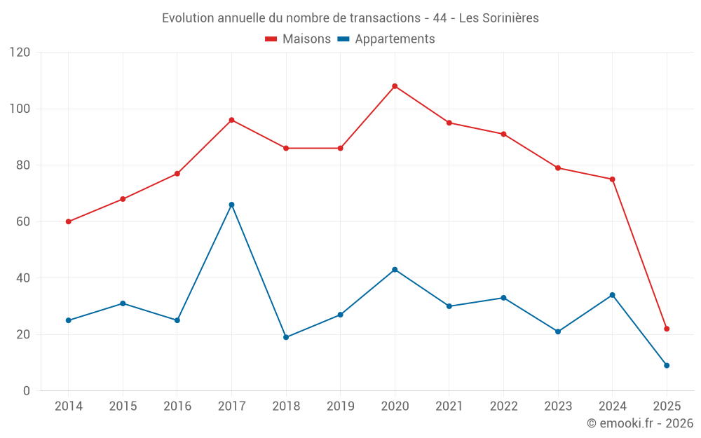 Le prix médian sur les 29 transactions d'appartements des 12 derniers mois dans la commune des Sorinières était de 3 106 € par mètre carré pour une valeur foncière médiane de 149 500 €. Sur cette période 60% des transactions se sont situées entre 2 530 et 3 407 € par mètre carré (du 2ème au 8ème déciles).