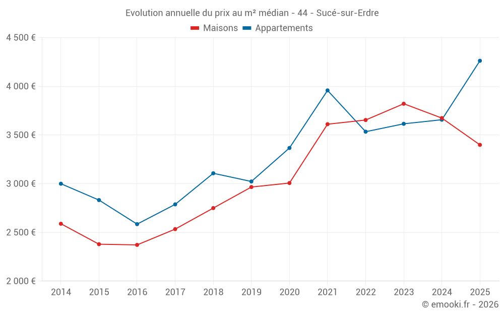 Le prix médian sur les 25 transactions de maisons des 6 derniers mois dans la commune de Sucé-sur-Erdre était de 3 399 € par mètre carré pour une valeur foncière médiane de 382 500 €. Sur cette période 60% des transactions se sont situées entre 2 919 et 4 116 € par mètre carré (du 2ème au 8ème déciles).