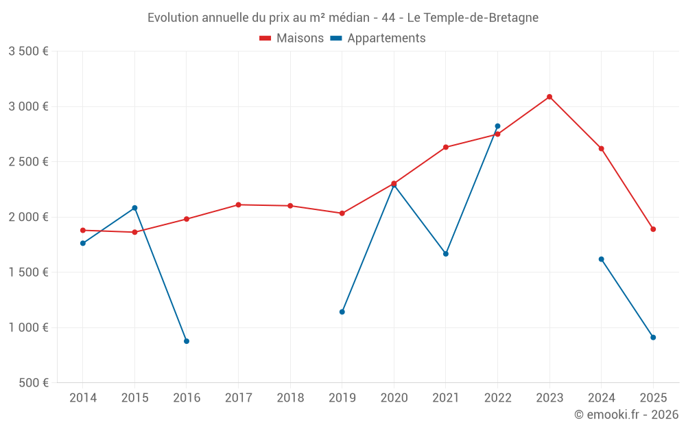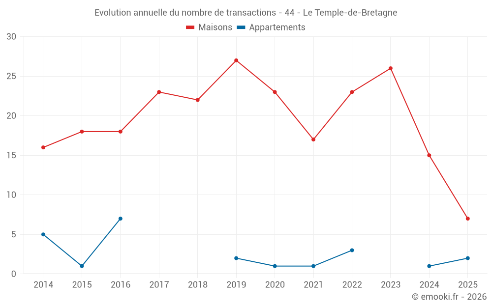 Le prix médian sur les 17 transactions de maisons des 12 derniers mois dans la commune du Temple-de-Bretagne était de 2 346 € par mètre carré pour une valeur foncière médiane de 249 000 €. Sur cette période 60% des transactions se sont situées entre 1 697 et 3 047 € par mètre carré (du 2ème au 8ème déciles).