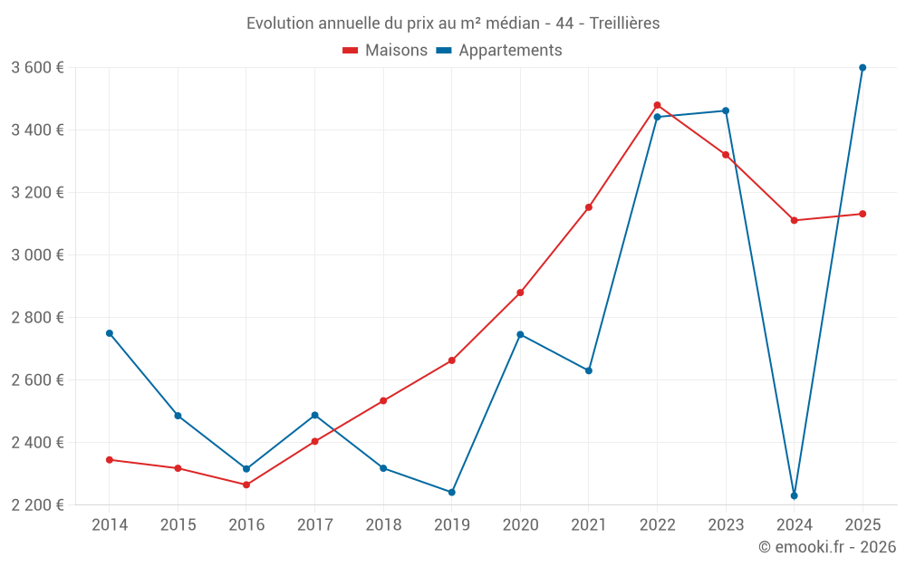 Le prix médian sur les 24 transactions de maisons des 6 derniers mois dans la commune de Treillières était de 3 132 € par mètre carré pour une valeur foncière médiane de 331 250 €. Sur cette période 60% des transactions se sont situées entre 2 632 et 3 731 € par mètre carré (du 2ème au 8ème déciles).