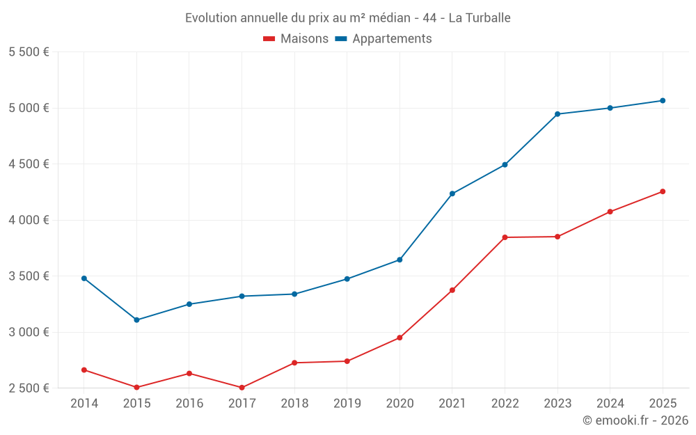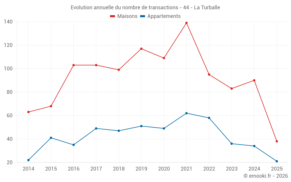 Le prix médian sur les 21 transactions d'appartements des 6 derniers mois dans la commune de la Turballe était de 5 066 € par mètre carré pour une valeur foncière médiane de 200 000 €. Sur cette période 60% des transactions se sont situées entre 4 268 et 5 667 € par mètre carré (du 2ème au 8ème déciles).