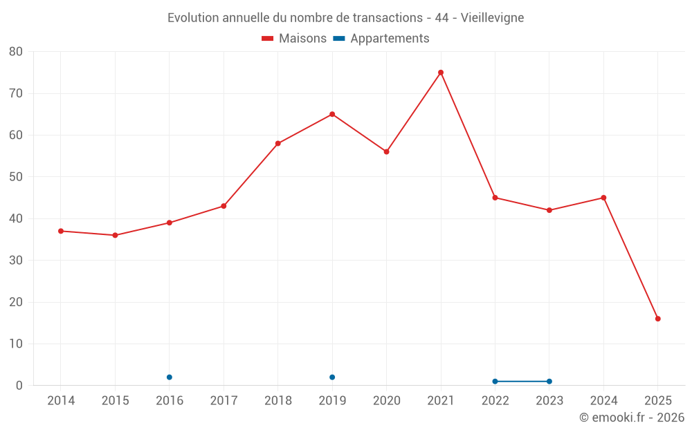 Le prix médian sur les 45 transactions de maisons des 12 derniers mois dans la commune de Vieillevigne était de 2 091 € par mètre carré pour une valeur foncière médiane de 198 000 €. Sur cette période 60% des transactions se sont situées entre 1 677 et 2 803 € par mètre carré (du 2ème au 8ème déciles).