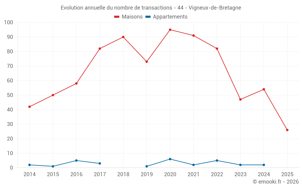 Le prix médian sur les 26 transactions de maisons des 6 derniers mois dans la commune de Vigneux-de-Bretagne était de 2 967 € par mètre carré pour une valeur foncière médiane de 326 750 €. Sur cette période 60% des transactions se sont situées entre 2 346 et 3 400 € par mètre carré (du 2ème au 8ème déciles).