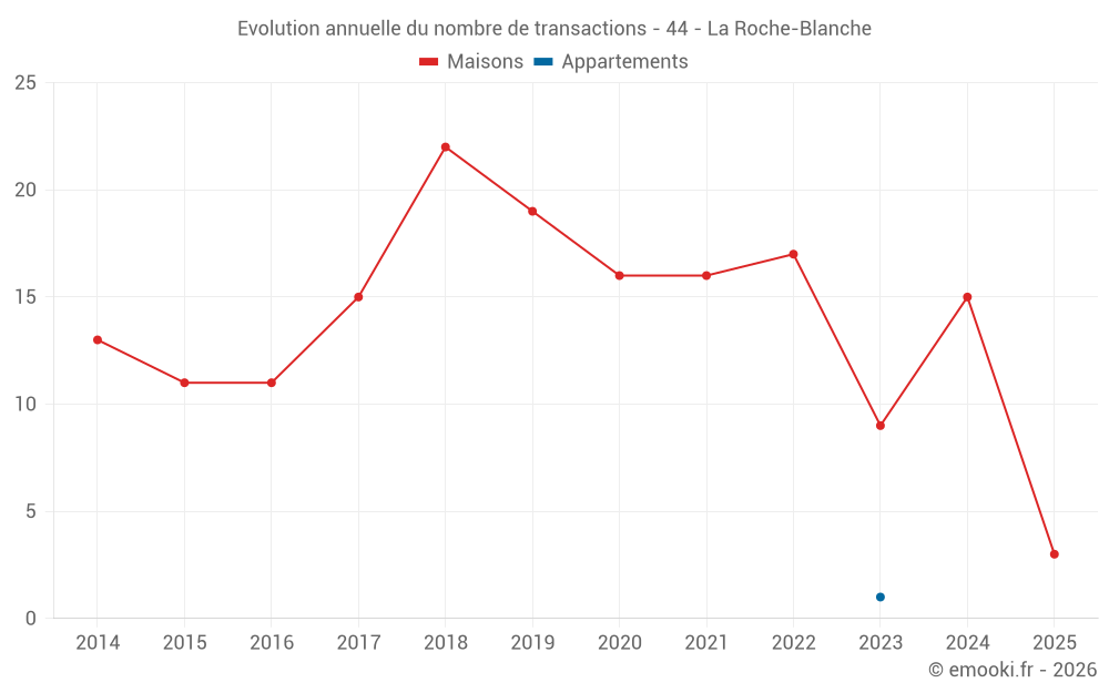 Le prix médian sur les 20 transactions de maisons des 24 derniers mois dans la commune de la Roche-Blanche était de 1 900 € par mètre carré pour une valeur foncière médiane de 171 500 €. Sur cette période 60% des transactions se sont situées entre 1 419 et 2 355 € par mètre carré (du 2ème au 8ème déciles).