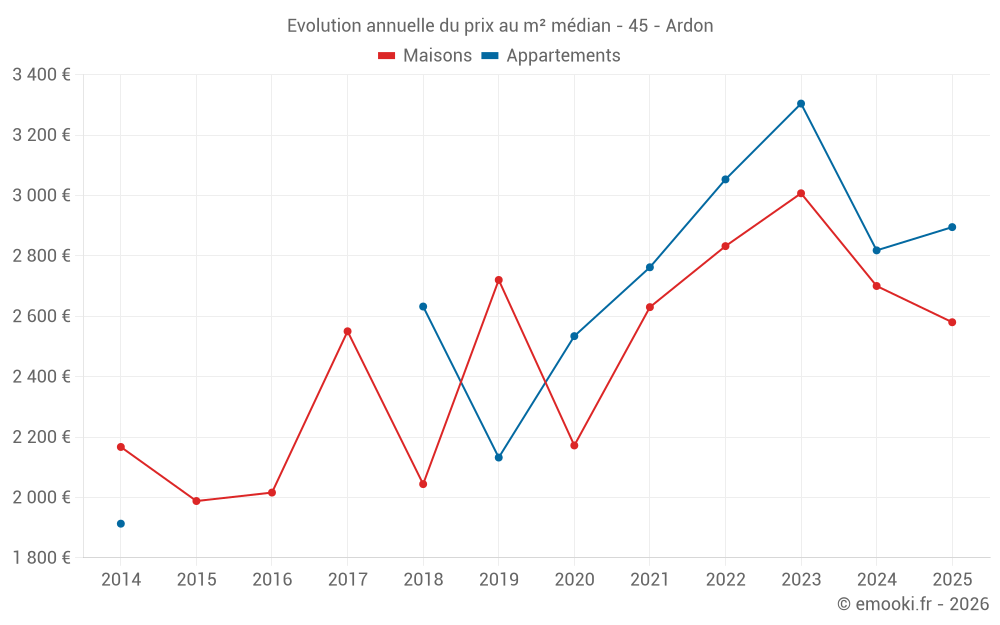 Le prix médian sur les 16 transactions de maisons des 12 derniers mois dans la commune d'Ardon était de 2 604 € par mètre carré pour une valeur foncière médiane de 390 170 €. Sur cette période 60% des transactions se sont situées entre 2 271 et 2 996 € par mètre carré (du 2ème au 8ème déciles).