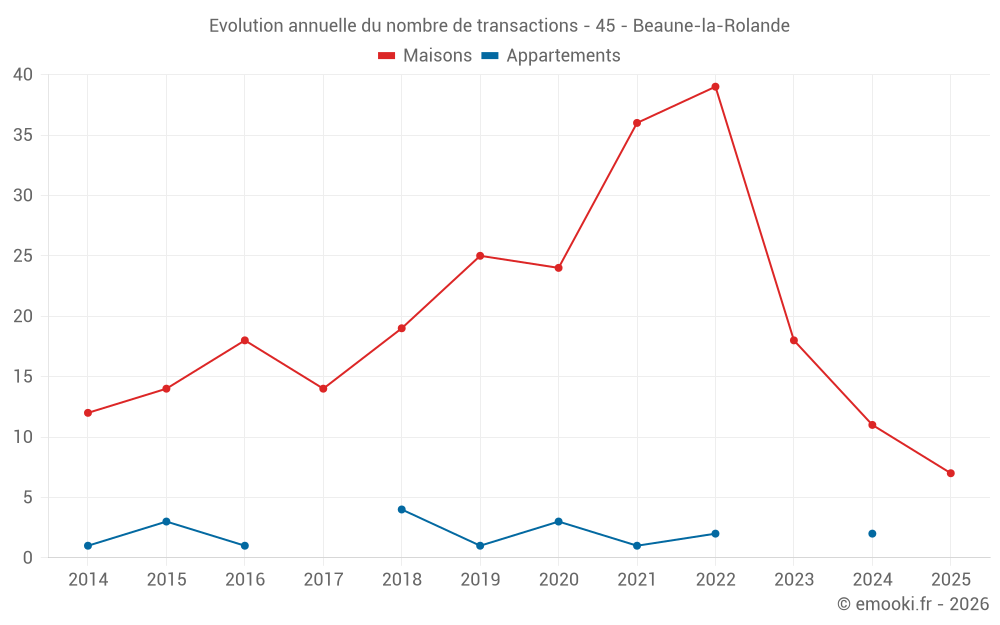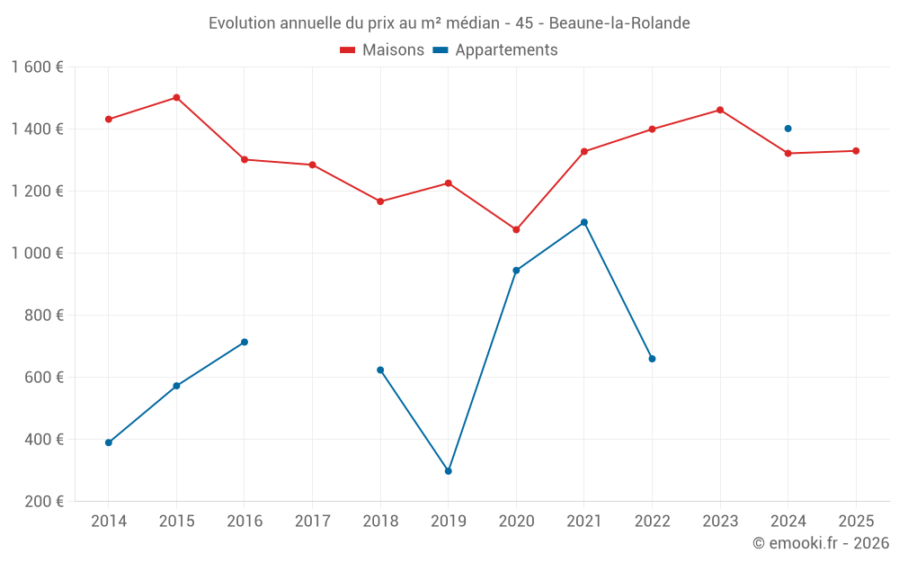 Le prix médian sur les 26 transactions de maisons des 24 derniers mois dans la commune de Beaune-la-Rolande était de 1 336 € par mètre carré pour une valeur foncière médiane de 106 000 €. Sur cette période 60% des transactions se sont situées entre 700 et 1 849 € par mètre carré (du 2ème au 8ème déciles).