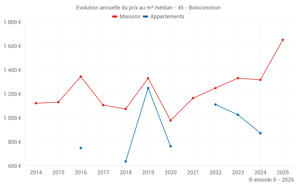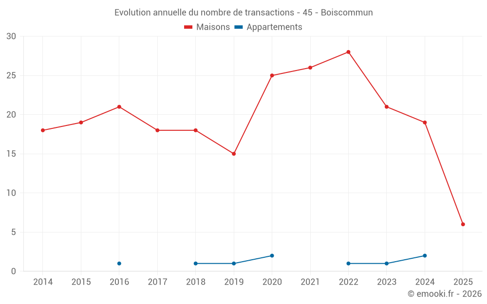 Le prix médian sur les 33 transactions de maisons des 24 derniers mois dans la commune de Boiscommun était de 1 452 € par mètre carré pour une valeur foncière médiane de 115 000 €. Sur cette période 60% des transactions se sont situées entre 861 et 1 789 € par mètre carré (du 2ème au 8ème déciles).