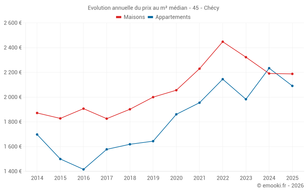 Le prix médian sur les 25 transactions de maisons des 6 derniers mois dans la commune de Chécy était de 2 188 € par mètre carré pour une valeur foncière médiane de 203 950 €. Sur cette période 60% des transactions se sont situées entre 1 932 et 2 627 € par mètre carré (du 2ème au 8ème déciles).