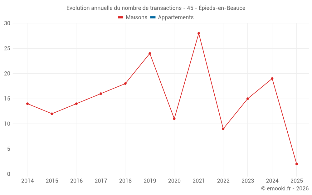 Le prix médian sur les 16 transactions de maisons des 12 derniers mois dans la commune d'Épieds-en-Beauce était de 1 490 € par mètre carré pour une valeur foncière médiane de 165 500 €. Sur cette période 60% des transactions se sont situées entre 852 et 2 160 € par mètre carré (du 2ème au 8ème déciles).