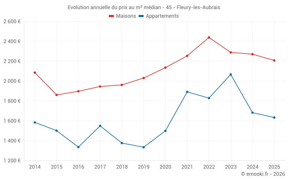 Le prix médian sur les 40 transactions de maisons des 6 derniers mois dans la commune de Fleury-les-Aubrais était de 2 208 € par mètre carré pour une valeur foncière médiane de 203 000 €. Sur cette période 60% des transactions se sont situées entre 1 865 et 2 595 € par mètre carré (du 2ème au 8ème déciles).