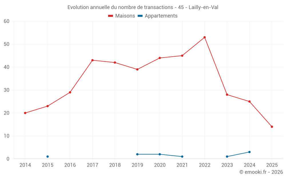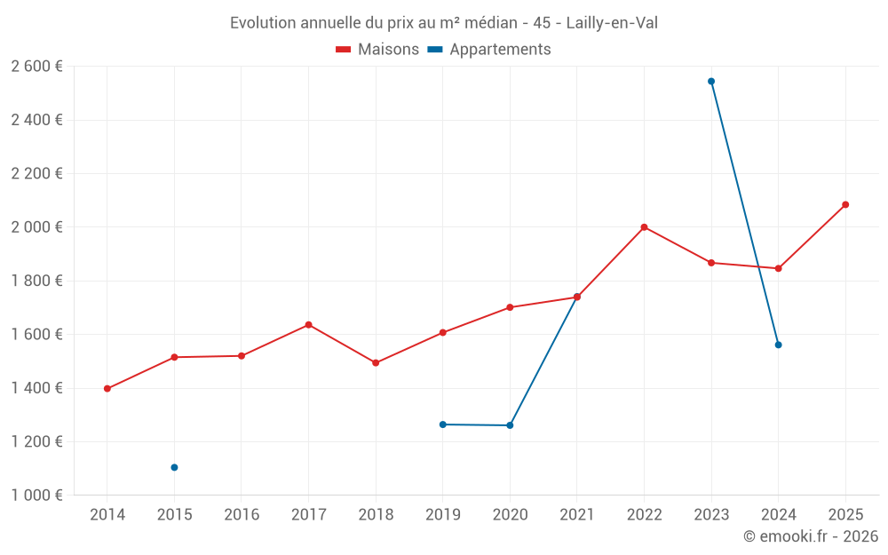Le prix médian sur les 31 transactions de maisons des 12 derniers mois dans la commune de Lailly-en-Val était de 1 907 € par mètre carré pour une valeur foncière médiane de 192 600 €. Sur cette période 60% des transactions se sont situées entre 1 333 et 2 429 € par mètre carré (du 2ème au 8ème déciles).