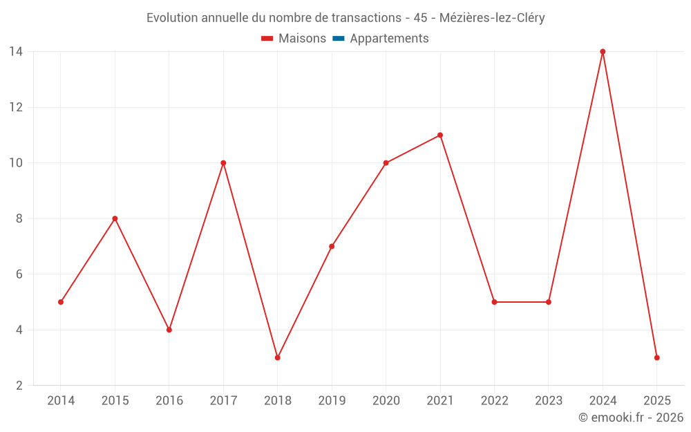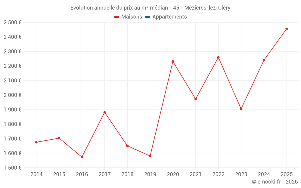 Le prix médian sur les 21 transactions de maisons des 24 derniers mois dans la commune de Mézières-lez-Cléry était de 2 006 € par mètre carré pour une valeur foncière médiane de 264 750 €. Sur cette période 60% des transactions se sont situées entre 1 730 et 2 626 € par mètre carré (du 2ème au 8ème déciles).