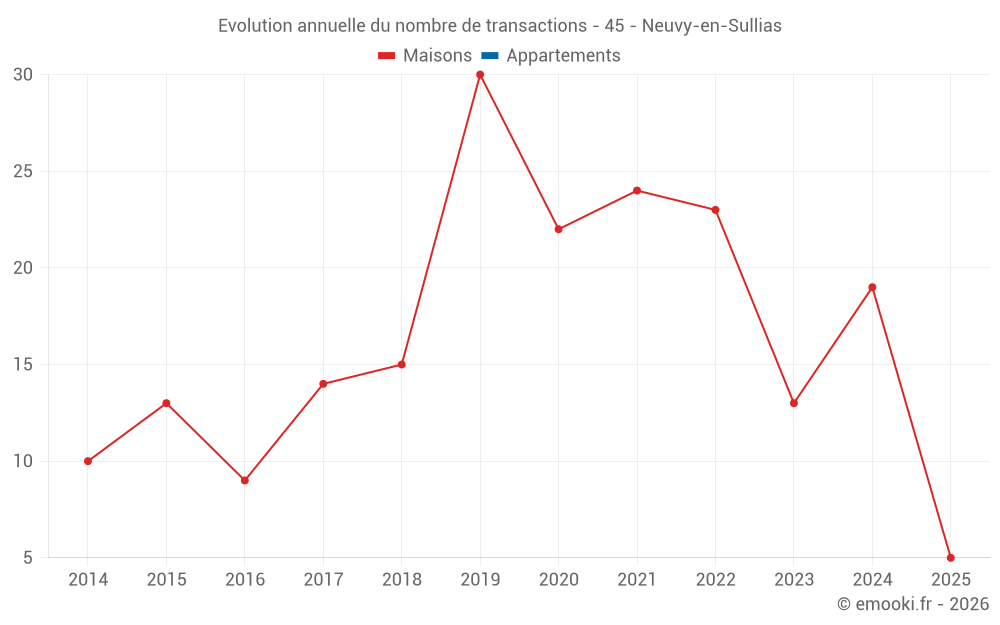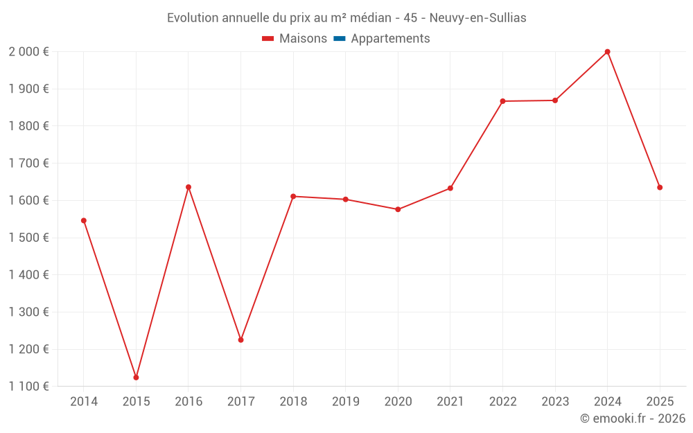 Le prix médian sur les 30 transactions de maisons des 24 derniers mois dans la commune de Neuvy-en-Sullias était de 1 920 € par mètre carré pour une valeur foncière médiane de 166 500 €. Sur cette période 60% des transactions se sont situées entre 1 549 et 2 303 € par mètre carré (du 2ème au 8ème déciles).