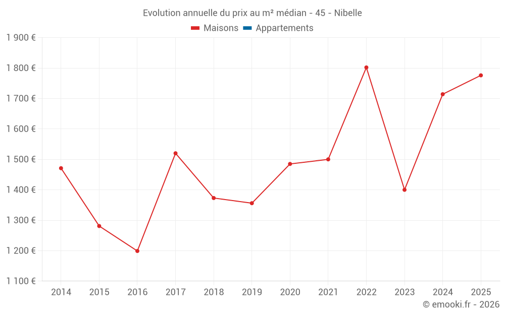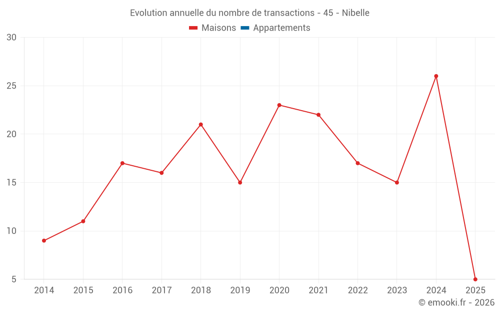 Le prix médian sur les 17 transactions de maisons des 12 derniers mois dans la commune de Nibelle était de 1 776 € par mètre carré pour une valeur foncière médiane de 154 510 €. Sur cette période 60% des transactions se sont situées entre 1 536 et 2 239 € par mètre carré (du 2ème au 8ème déciles).