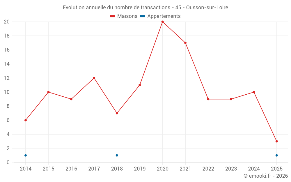 Le prix médian sur les 19 transactions de maisons des 24 derniers mois dans la commune d'Ousson-sur-Loire était de 1 222 € par mètre carré pour une valeur foncière médiane de 126 000 €. Sur cette période 60% des transactions se sont situées entre 819 et 1 708 € par mètre carré (du 2ème au 8ème déciles).