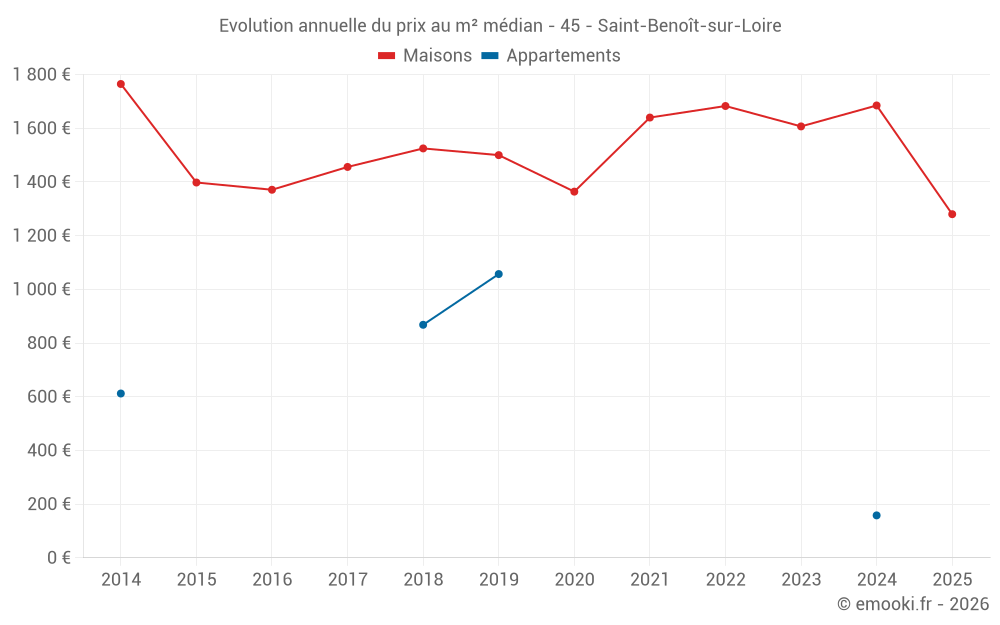 Le prix médian sur les 27 transactions de maisons des 12 derniers mois dans la commune de Saint-Benoît-sur-Loire était de 1 421 € par mètre carré pour une valeur foncière médiane de 195 000 €. Sur cette période 60% des transactions se sont situées entre 1 069 et 2 458 € par mètre carré (du 2ème au 8ème déciles).