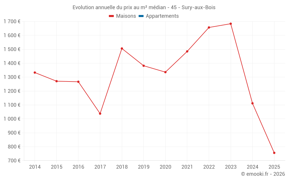 Le prix médian sur les 16 transactions de maisons des 24 derniers mois dans la commune de Sury-aux-Bois était de 1 160 € par mètre carré pour une valeur foncière médiane de 125 000 €. Sur cette période 60% des transactions se sont situées entre 719 et 1 768 € par mètre carré (du 2ème au 8ème déciles).