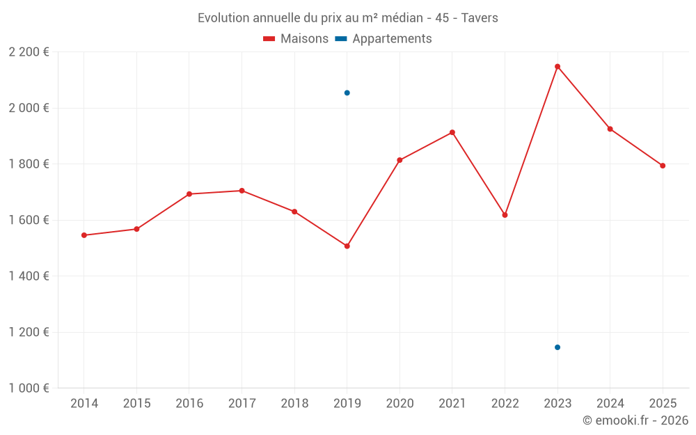 Le prix médian sur les 16 transactions de maisons des 12 derniers mois dans la commune de Tavers était de 1 791 € par mètre carré pour une valeur foncière médiane de 145 430 €. Sur cette période 60% des transactions se sont situées entre 1 524 et 2 419 € par mètre carré (du 2ème au 8ème déciles).