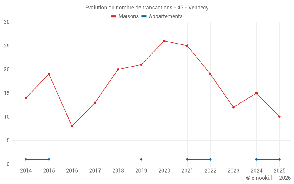 Le prix médian sur les 19 transactions de maisons des 12 derniers mois dans la commune de Vennecy était de 2 147 € par mètre carré pour une valeur foncière médiane de 220 000 €. Sur cette période 60% des transactions se sont situées entre 1 874 et 2 404 € par mètre carré (du 2ème au 8ème déciles).
